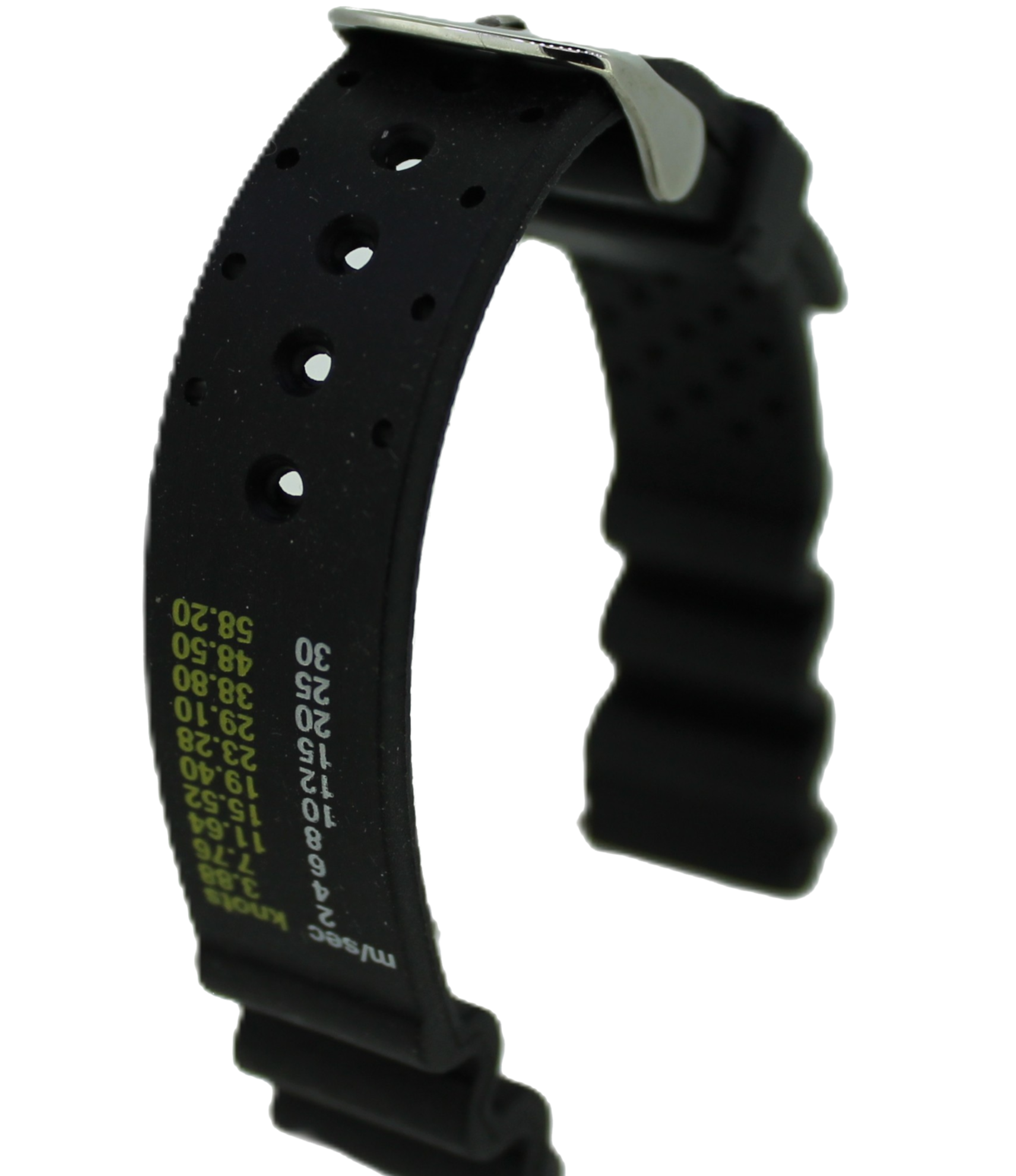 Robustes Kautschukband für Taucheruhren in klassischem Schwarz. Das strapazierfähige Material bietet optimale Beständigkeit gegen Salzwasser, Chlor und UV-Strahlung. Die flexible Struktur passt sich dem Handgelenk an und ermöglicht sicheren Halt auch mit Tauchanzug. Ideal für Sporttaucher und Wassersportler, die ein zuverlässiges, wartungsarmes Band suchen. Langlebig und komfortabel für intensive Nutzung.