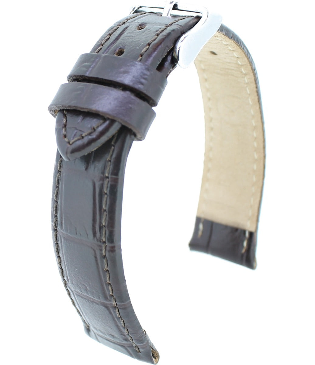 Das Uhrenband Marsala aus hochwertigem Kalbleder wurde speziell für Chronographen entwickelt und überzeugt mit einer markanten Alligator-Prägung in matter Optik. Die dezente Bombierung am Uhrenanstoß sorgt für ein harmonisches Zusammenspiel mit massiven Gehäusen und verleiht dem Band eine kräftige, zugleich elegante Form. Die Bandstärke verläuft abfallend von ca. 5,0 mm auf 3,0 mm und bietet dadurch festen Halt sowie angenehmen Tragekomfort. Die handvernähte Verarbeitung steht für höchste Qualität und Langlebigkeit. Mit einer langen Länge von 128 x 85 mm eignet sich das Band ideal für größere Handgelenke. Das Kalbleder ist weich, strapazierfähig und entwickelt mit der Zeit eine charaktervolle Patina. Ein stilvolles und funktionales Band für anspruchsvolle Uhrenliebhaber mit Sinn für klassische Sportlichkeit.