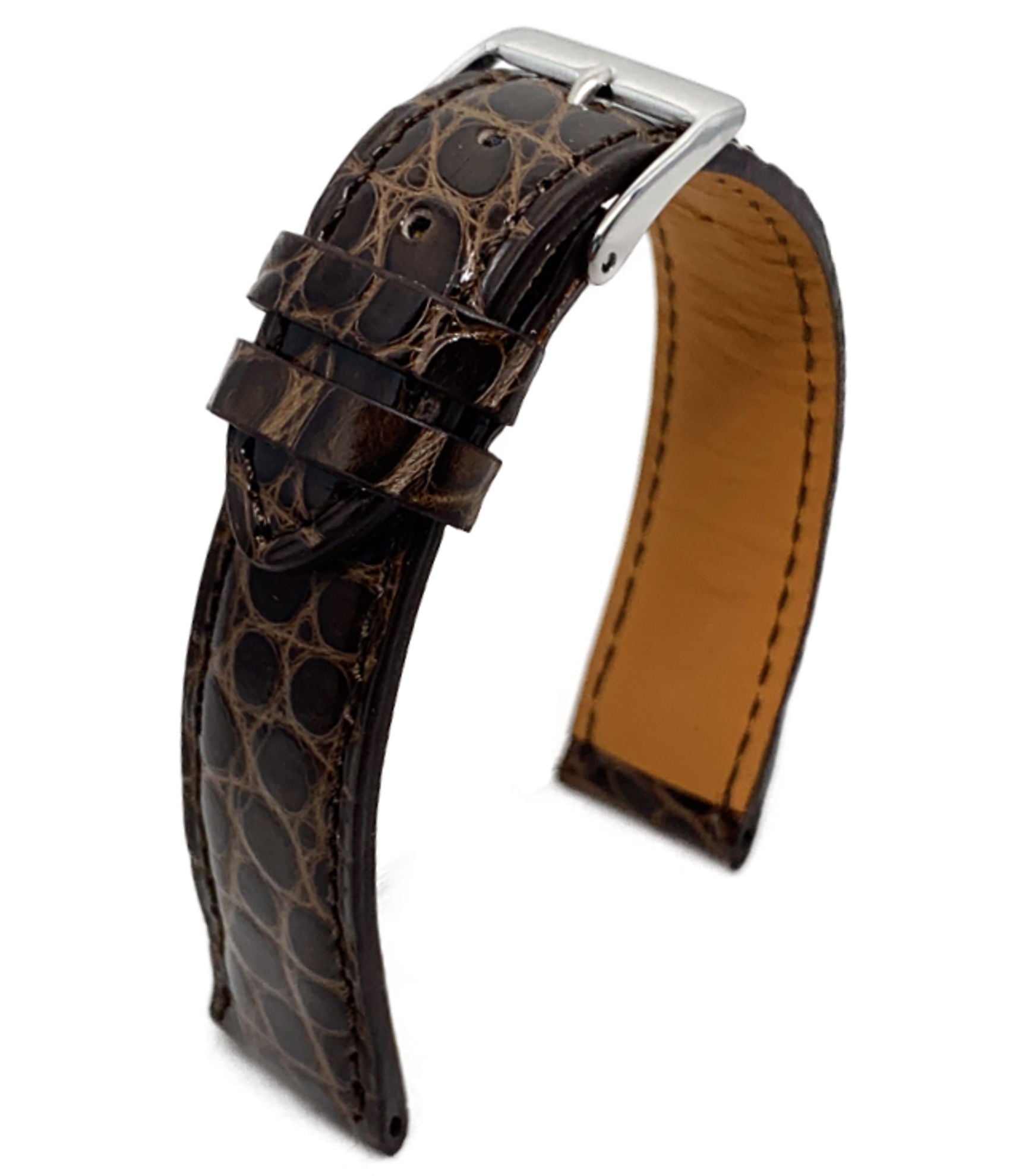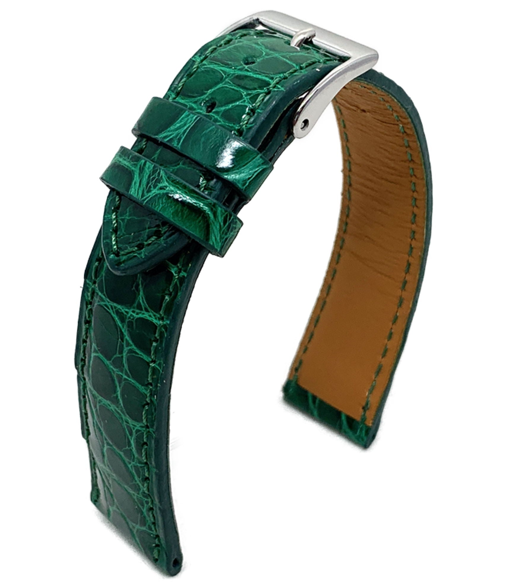 Dieses elegante Uhrenarmband wird aus zertifiziertem Alligatoren-Flankenleder gefertigt und überzeugt durch seine glänzende Oberfläche sowie die feine Ton in Ton Naht. Die natürliche Struktur des Leders verleiht dem Band eine edle und zeitlose Ausstrahlung. Beim Anstoß leicht bombiert und zur Schließe hin verjüngt, bietet das Band eine elegante Linienführung und einen angenehmen Sitz am Handgelenk. Es eignet sich ideal als hochwertiges Ersatzband für klassische Armbanduhren. Das fein verarbeitete Leder steht für höchste Qualität, Langlebigkeit und exklusive Optik. In verschiedenen Farben erhältlich und perfekt für Uhrenliebhaber, die auf Stil und Handwerkskunst Wert legen.