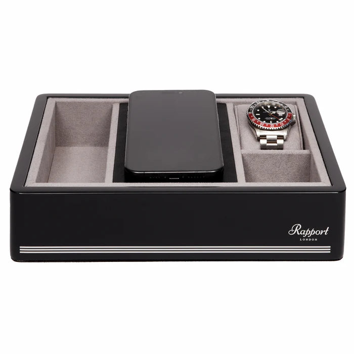 Die Formula Wireless Charging und Uhrenbox ist ein von Experten gefertigtes Tablett, das speziell für anspruchsvolle Nutzerinnen und Nutzer entwickelt wurde. Das kabellose Ladegerät mit QI-Zertifizierung ermöglicht ein einfaches und sicheres Laden aller kompatiblen Smartphones direkt auf dem edlen, lederbezogenen Bereich. Der Innenraum ist mit einem glatten Material ausgekleidet und bietet praktischen Platz für Ihre Uhr sowie weitere Accessoires. Mit den Maßen von 250 mm Breite, 200 mm Tiefe und 55 mm Höhe fügt sich die Box harmonisch in Ihr Schlafzimmer oder Büro ein und sorgt für Ordnung auf dem Nachttisch oder Schreibtisch. Dieses Produkt vereint Schweizer Qualitätsanspruch mit funktionalem Design und unterstützt Sie dabei, Ihre wertvollen Zeitmesser und Geräte stilvoll aufzubewahren und zu laden.