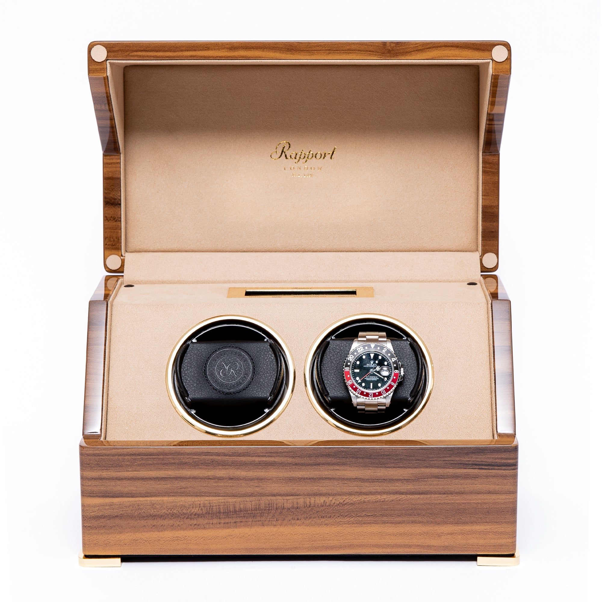 Der Perpetua Double Watch Winder verbindet traditionelle Handwerkskunst mit moderner Technik. Das handgefertigte Gehäuse im klassischen Rapport Design verleiht jedem Zuhause eine elegante Note und schützt Ihre Automatikuhren optimal. Die dritte Generation dieses Bestsellers wurde verfeinert, um Ihnen eine einfache Handhabung und höchste Funktionalität zu bieten. Das luxuriöse Innenfutter aus weichem Wildleder schont Ihre Uhrenbänder aus Leder, Edelstahl oder Kautschuk. Über das diskret integrierte LCD-Touchscreen-Display steuern Sie die Drehrichtung und den Aufzugsmodus individuell nach Ihren Bedürfnissen. Die nahezu geräuschlosen Motoren sorgen für einen ungestörten Betrieb. Die Stromversorgung erfolgt über ein weltweit einsetzbares DC-Netzteil, das im Lieferumfang enthalten ist. Mit dem Perpetua Uhrenbeweger profitieren Sie von Schweizer Qualität und nachhaltiger Verarbeitung – ein perfektes Zubehör für anspruchsvolle Uhrenträgerinnen und Uhrenträger.