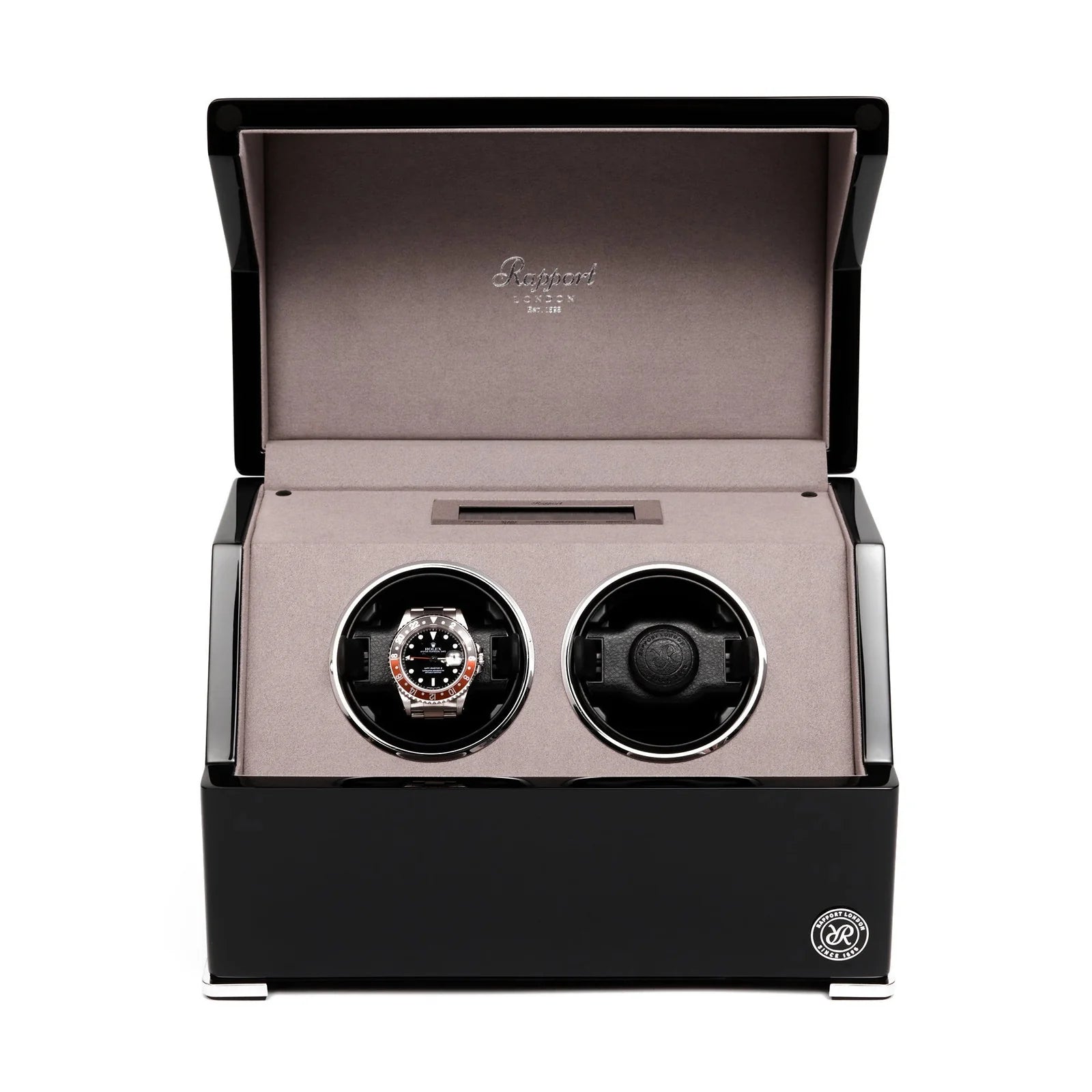 Der Perpetua Double Watch Winder verbindet traditionelle Handwerkskunst mit moderner Technik. Das handgefertigte Gehäuse im klassischen Rapport Design verleiht jedem Zuhause eine elegante Note und schützt Ihre Automatikuhren optimal. Die dritte Generation dieses Bestsellers wurde verfeinert, um Ihnen eine einfache Handhabung und höchste Funktionalität zu bieten. Das luxuriöse Innenfutter aus weichem Wildleder schont Ihre Uhrenbänder aus Leder, Edelstahl oder Kautschuk. Über das diskret integrierte LCD-Touchscreen-Display steuern Sie die Drehrichtung und den Aufzugsmodus individuell nach Ihren Bedürfnissen. Die nahezu geräuschlosen Motoren sorgen für einen ungestörten Betrieb. Die Stromversorgung erfolgt über ein weltweit einsetzbares DC-Netzteil, das im Lieferumfang enthalten ist. Mit dem Perpetua Uhrenbeweger profitieren Sie von Schweizer Qualität und nachhaltiger Verarbeitung – ein perfektes Zubehör für anspruchsvolle Uhrenträgerinnen und Uhrenträger.